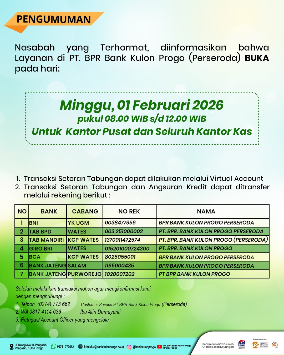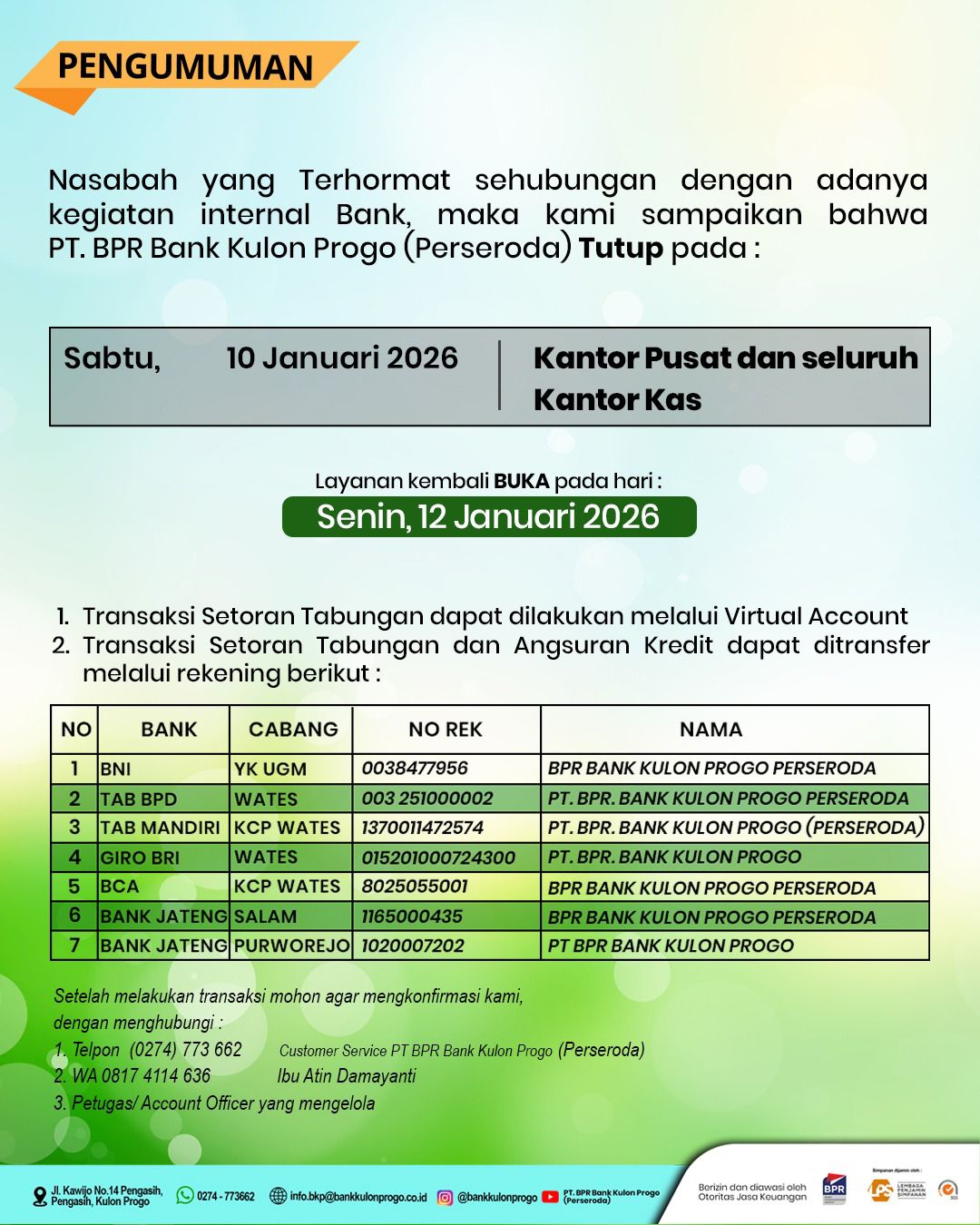 Sehubungan dengan telah terbitnya Persetujuan Pengalihan izin Usaha dan Penggunaan Izin Usaha BPR dengan Nama Baru dari OJK Daerah Istimewa Yogyakarta Nomor S-30/KO.134/2025 tanggal 16 Januari 2025 dan Keputusan Kepala OJK Provinsi Jawa Tengah Nomor KEP-16/KO.13/2025 tentang Pengalihan Izin Usaha Dan Perubahan Nama Dari Perusahaan Umum Daerah Bank Perkreditan Rakyat Bank Kulon Progo Kepada Perseroan Terbatas Bank Perekonomian Rakyat Bank Kulon Progo (Perseroda) , bersama ini kami informasikan bahwa terhitung mulai tanggal 16 Januari 2025 dan seterusnya menggunakan nama PT. Bank Perekonomian Rakyat Bank Kulon Progo (Perseroda)